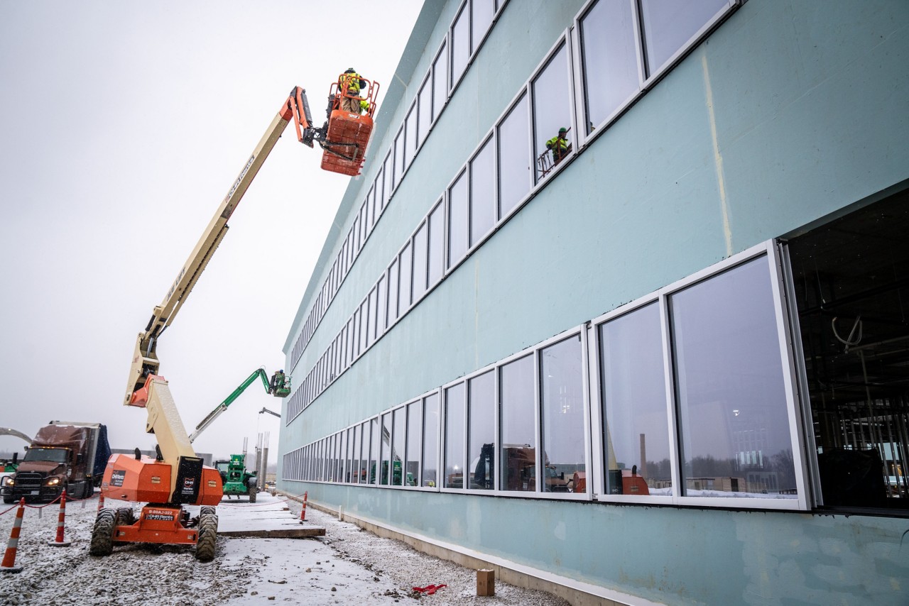 On November 18, 2022, windows were being installed in one wing of the Research & Development facility. Soon, the wing will be fully enclosed – a major milestone for the project.