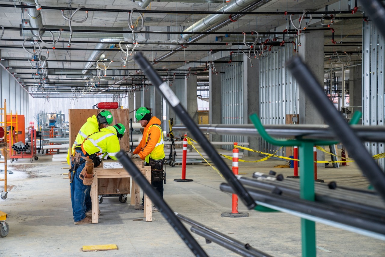 The highly skilled crews on the Building Our Future project are working to construct buildings that will last for generations. Here, a team takes a moment to review their plan to ensure quality and accuracy.