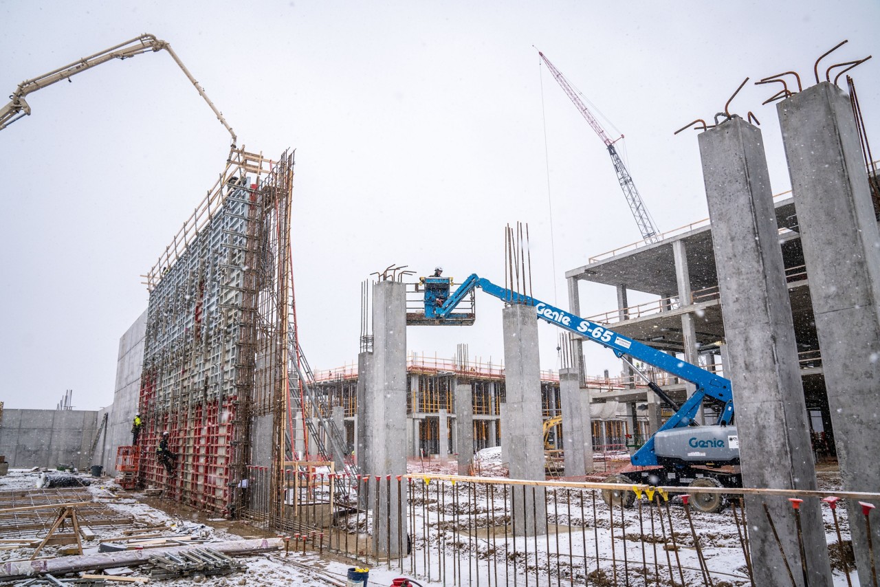 Amidst a light dusting of snow, the Building Our Future crew poured concrete columns in one of the Research & Development wings.